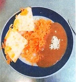 One small flour tortilla, quezadilla, filled with cheese & meat of your choice, steak or chicken. Served with rice & beans or french fries.