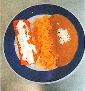 One red enchilada (corn tortilla) rolled up and filled with cheese & meat of your choice, steak, chicken, or cheese only. Served with rice & beans.
